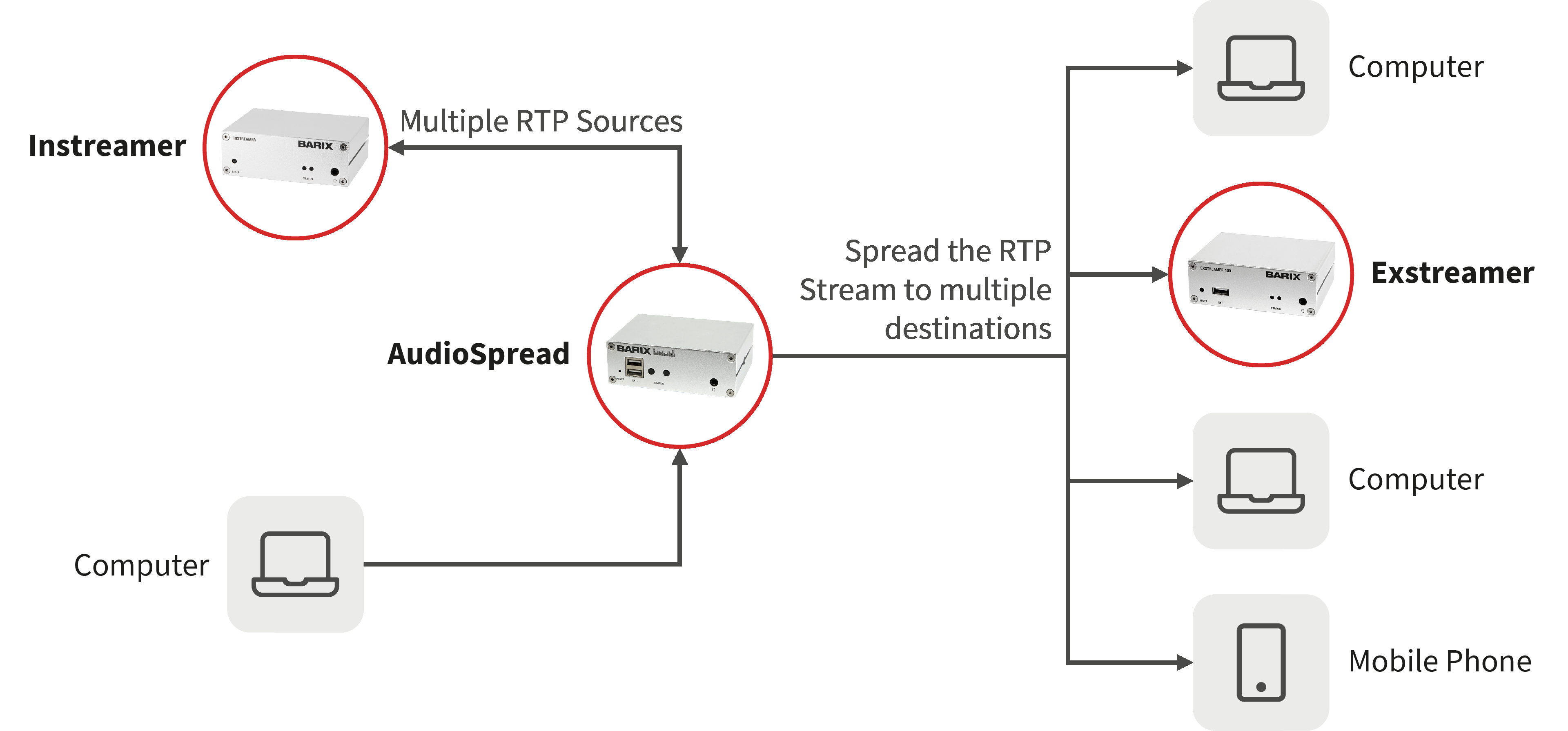 Any stream sent to the AudioSpread on UDP port 3033 will be spread to the defined addresses on the defined ports.
