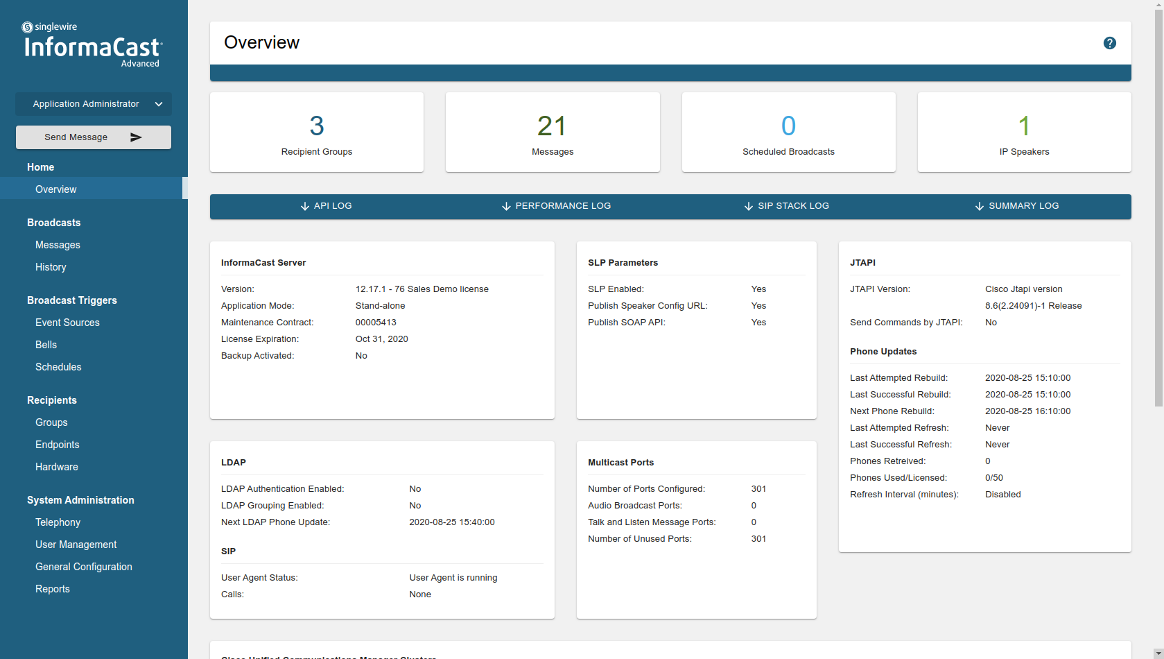- Informacast virtual appliance running on a PC (in this example it is used the latest version of Informacast advanced 12.17.1)