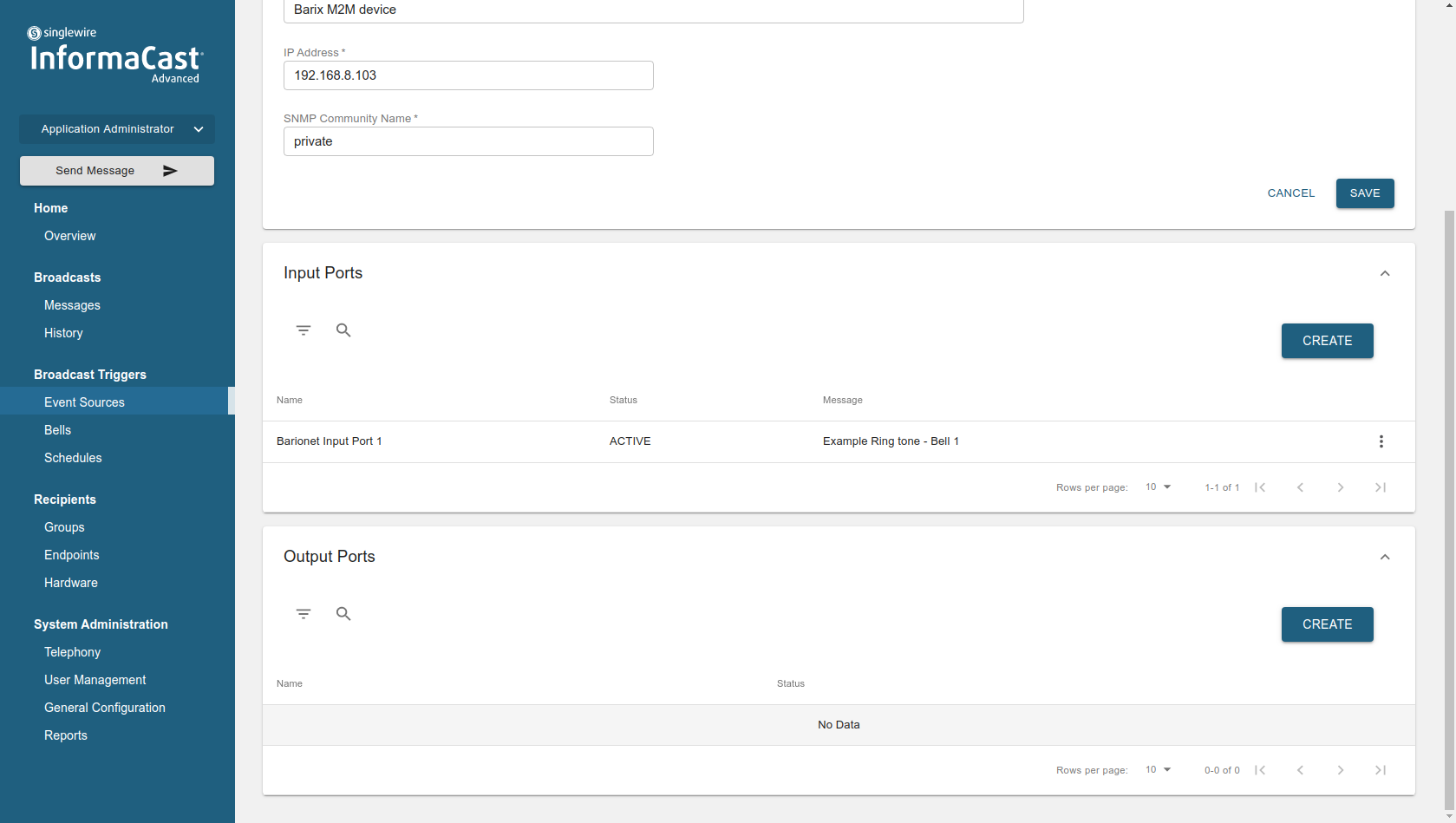 - After clicking on save the Input and Output ports fields become active so it's possible to add Input / Output ports associated with the device. Click on CREATE in correspondence of Input Ports to add your first port.
