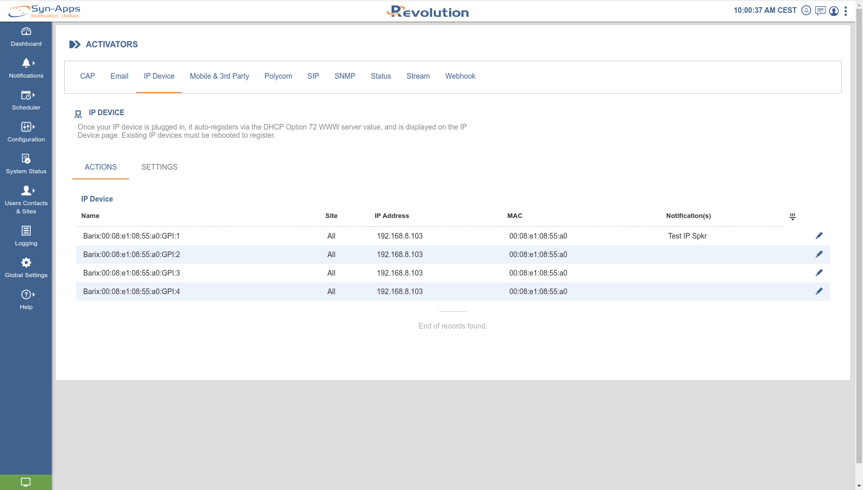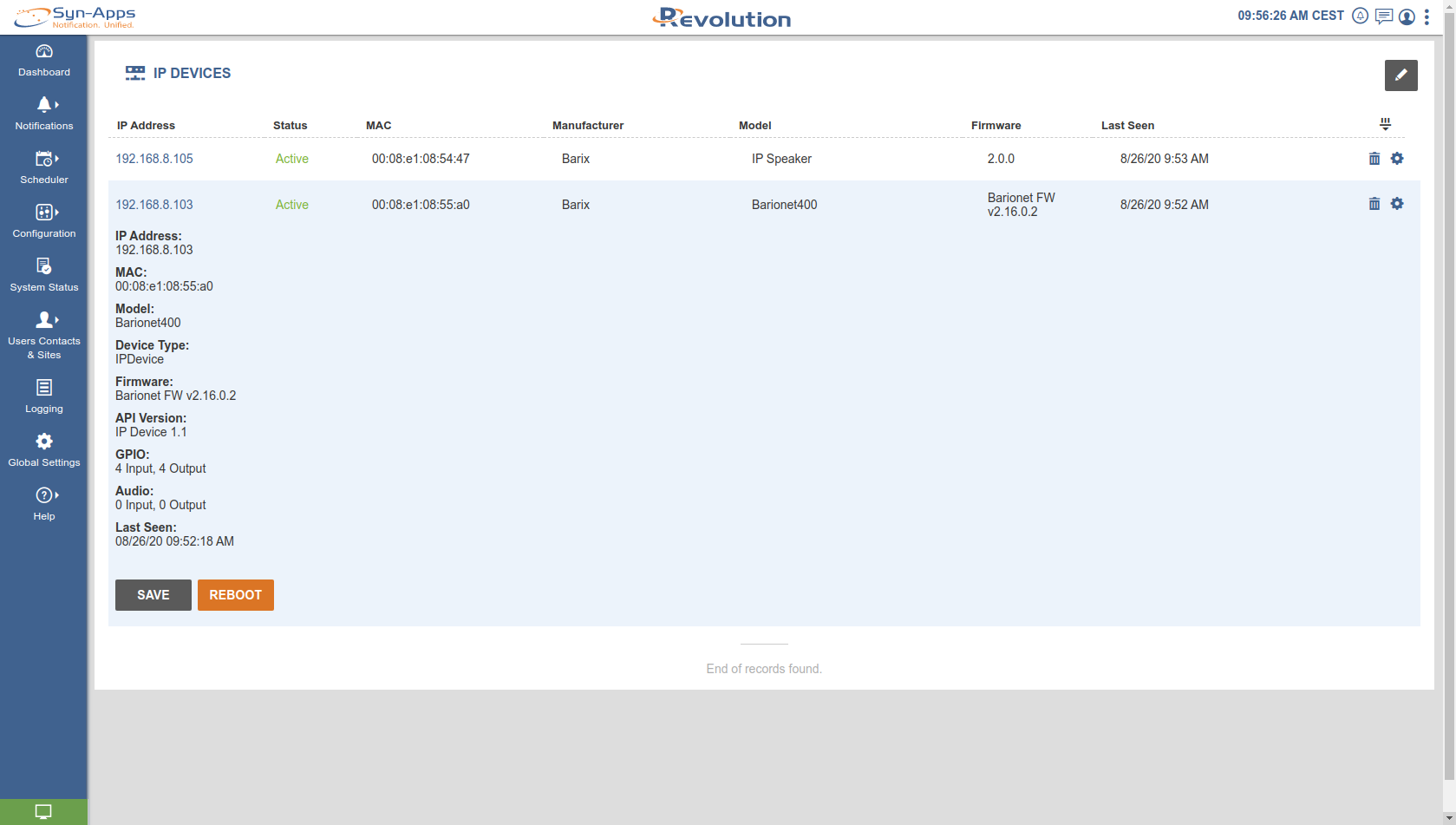 When the Barionet 400 is registered with a SynApps server is shown automatically as an IP Device under Configuration → IP Devices