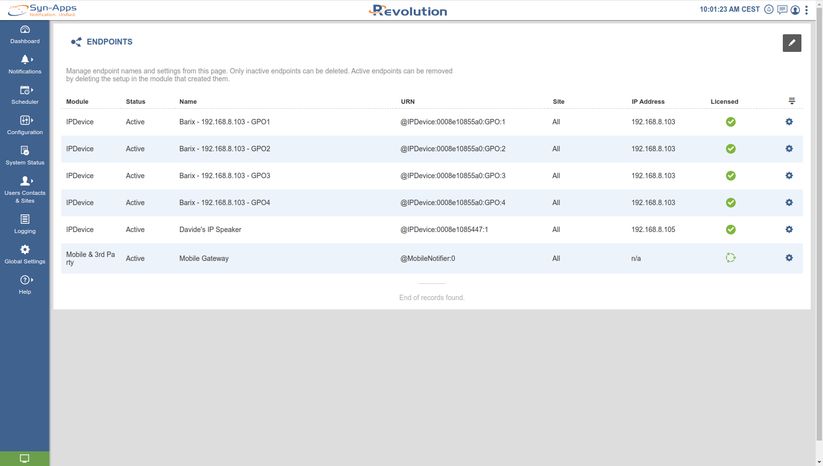 While GPO (General Purpose Outputs) are listed automatically under Configuration → ENDPOINTS (Note also the IP Speaker registered as Endpoint device)