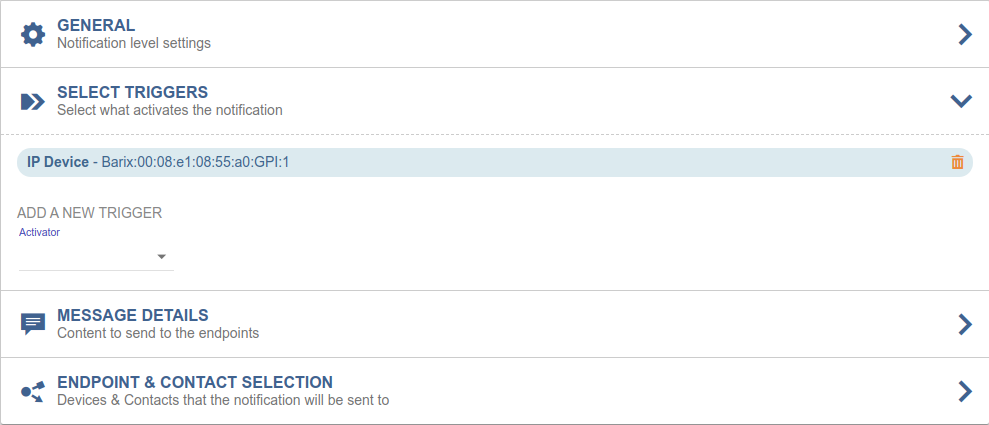 Select Triggers: here is where to select the GPI of the Barionet that will be used to activate the notification