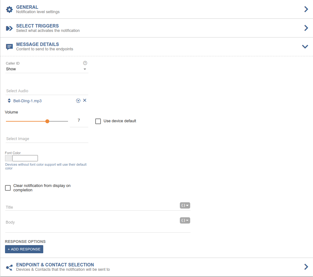 Message Details: Where to select the audio file to be sent plus other settings related to the notification content (depending on the type selected in step a)