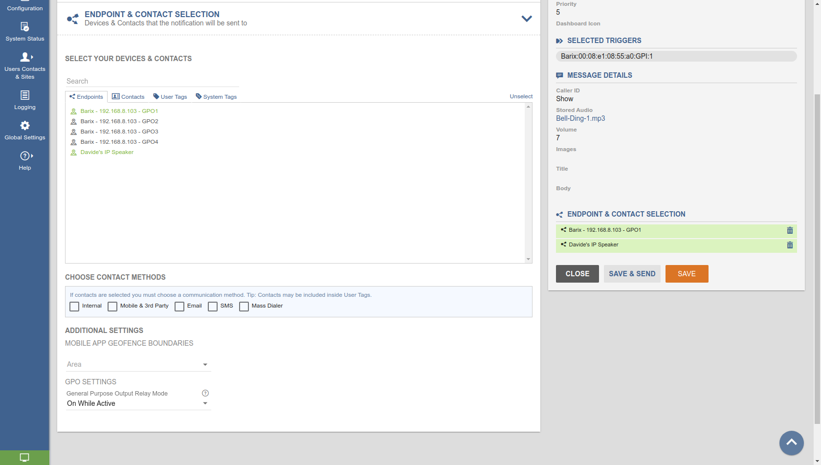 Endpoint and contact selection: set the RECEIVER of the notification. In our case we select our Barix IP Speaker and the GPO 1 of the Barionet (note the GPO settings: ON WHILE ACTIVE - this tells to activate the relay during the notification and de-activate it when the notification ends, other values are available from the drop down menu depending on the needs)