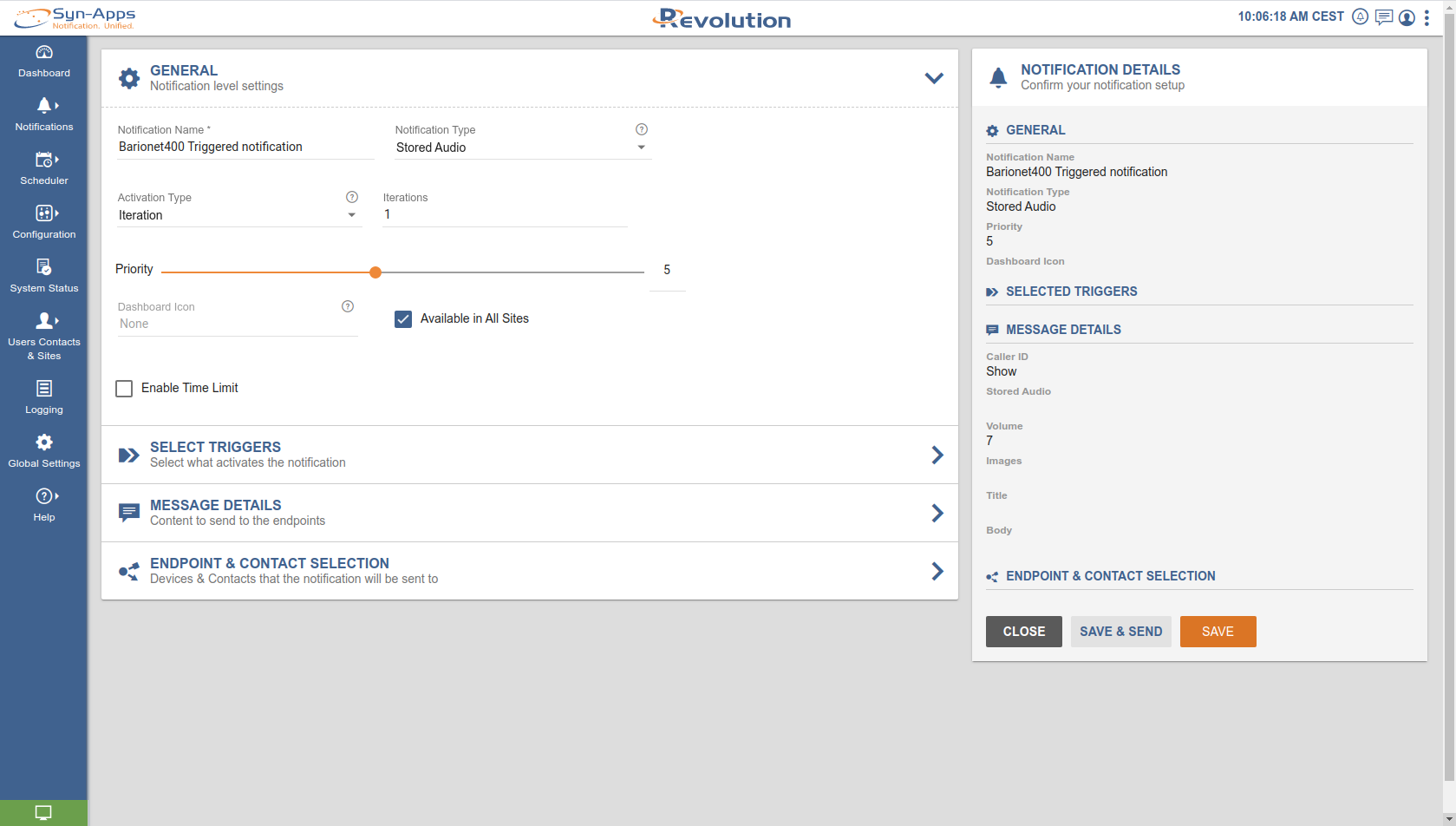 Done! Your notification is now ready to be activated from Bariont400 Input 1. Push the button and watch the relay 1 led switching on and if you have an IP Speaker from Barix registered with SynApps as well you will hear the stored audio file playing.