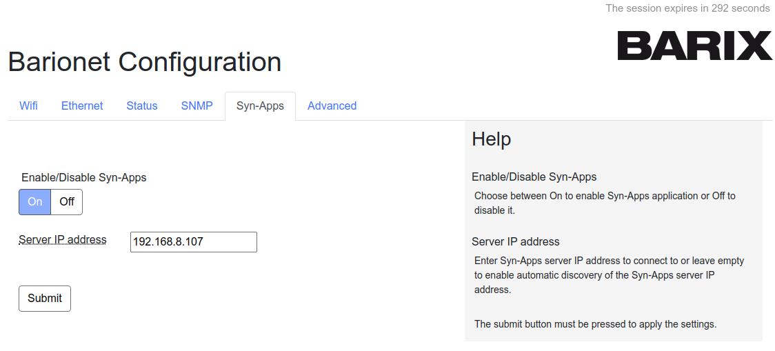 If the device cannot discover DHCP OPT72 then it needs to know the SynApps server address to connect with - In this case fill in the Server IP Address field