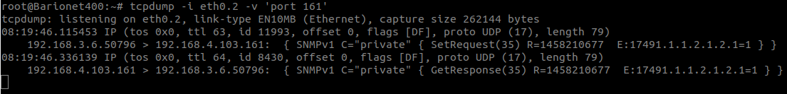 CODEtcpdump -i eth0.2 -v 'port 161'The output will look like this (if the SNMP packets are received otherwise is a sign that packets are not received by Barionet)