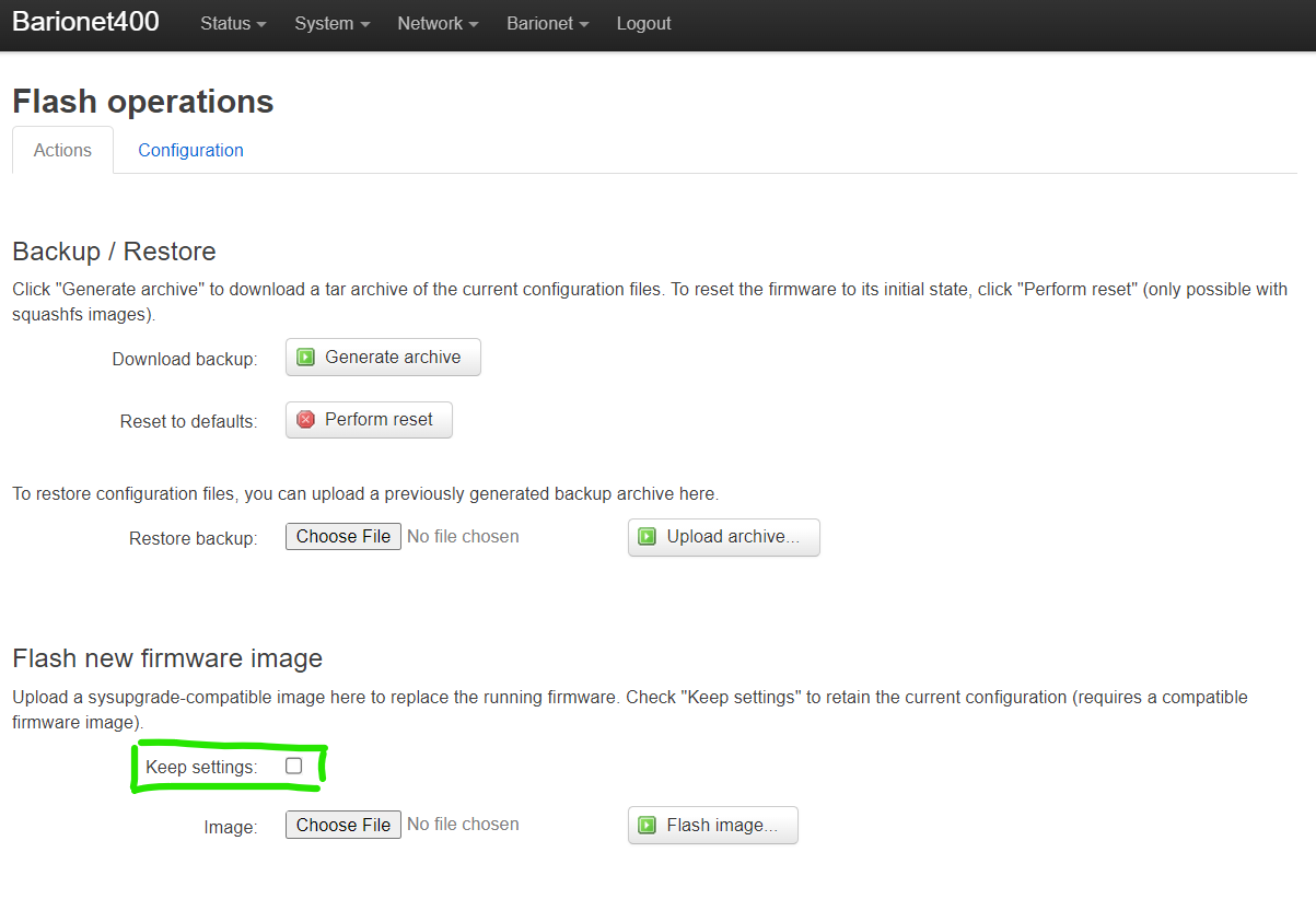 Update the firmware of your device to the latest version available. Check the Barionet 400 - Release Documentation to find the download link to the latest released firmware.