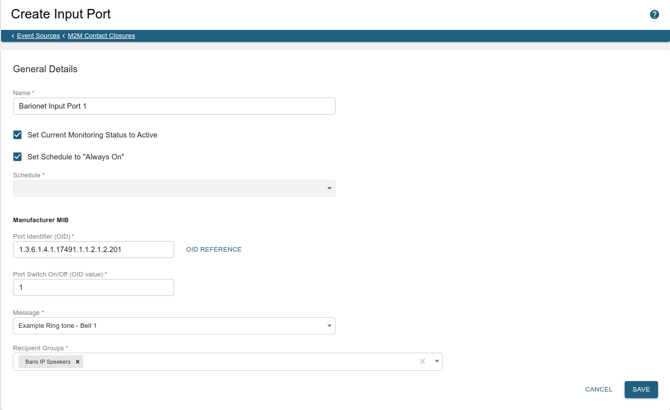Done! Now you are ready to trigger a notification (Ring Tone Bell from this example) by closing a contact on Barionet400, the notification is then sent to all the members of the recipients group created, in our case IP Speaker running on an IP former device.