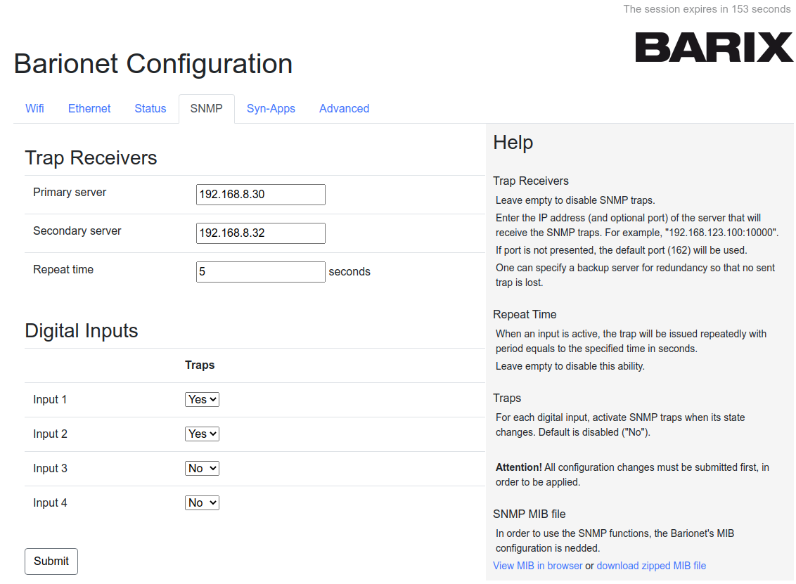 Enable the traps for the inputs where the contact closure is connected and click on Submit.