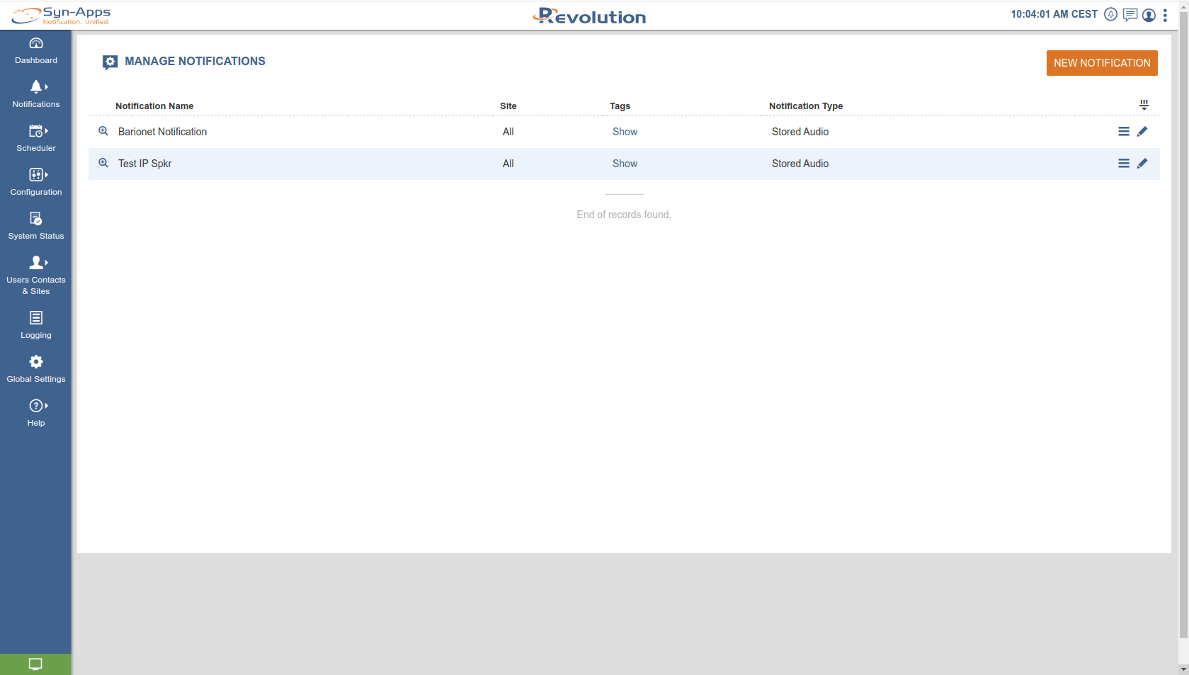 From SynApps left side navigation menu open Notifications → Manage and click on NEW NOTIFICATION