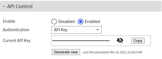 By default, the chosen method is API Key, and the device uses a random API Key. The user can generate a new API Key in the Settings page of the web interface. When generating a new API Key the previous one becomes invalid.