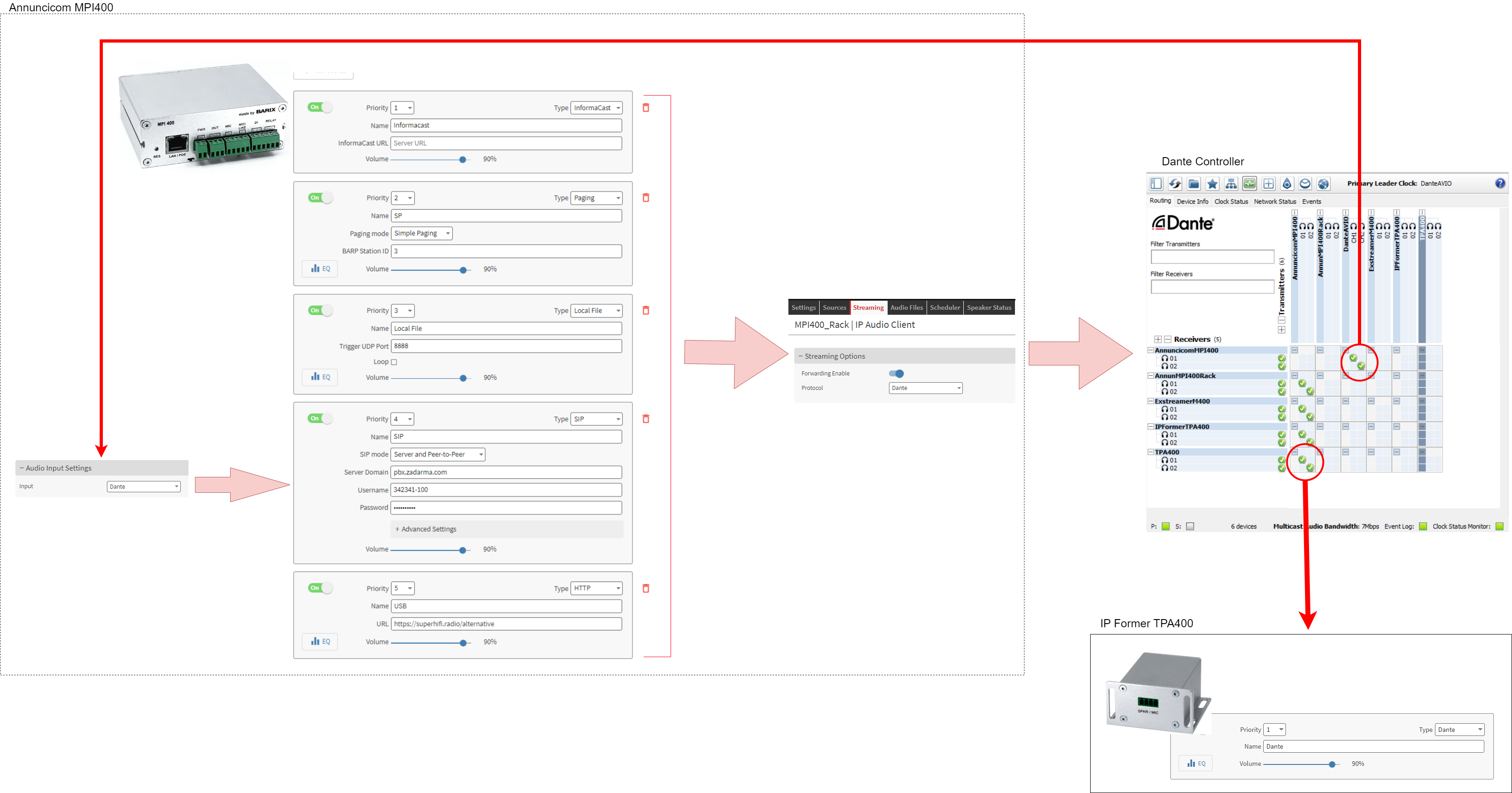 Below is a configuration example for an Annuncicom MPI400 forwarding its MAIN output with all source configuration to Dante, the Dante Controller is used to route this audio to other IPAC devices receiving the stream on a Dante source. Note also the Dante AVIO on DC feeding the Annuncicom MPI400, this can be the feed of the SIP source running on the device