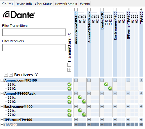 The implementation includes a fully Dante® compatible solution including: device advertisement, discovery, ptp, control. This means that IPAC Dante® devices appear automatically in the Dante® Controller in the Transmitter and Receiver rows: