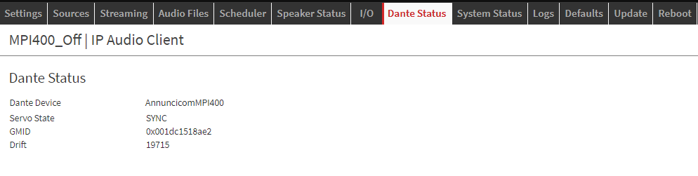 Mainly the ‘Servo State’ is the information that tells whether the PTP clock is in SYNC or not. When not in sync Dante® won’t play. The GMID is the ID of the current PTP leader (normally this is the mac address of the device provides the clock in the system).