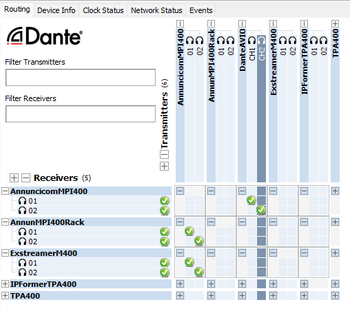 In the below screen you see the Dante AVIO feeding the Annuncicom MPI400 inputs, and the Annuncicom MPI400 outputs feeding other local devices running Dante. This configuration has to be applied on both sites.