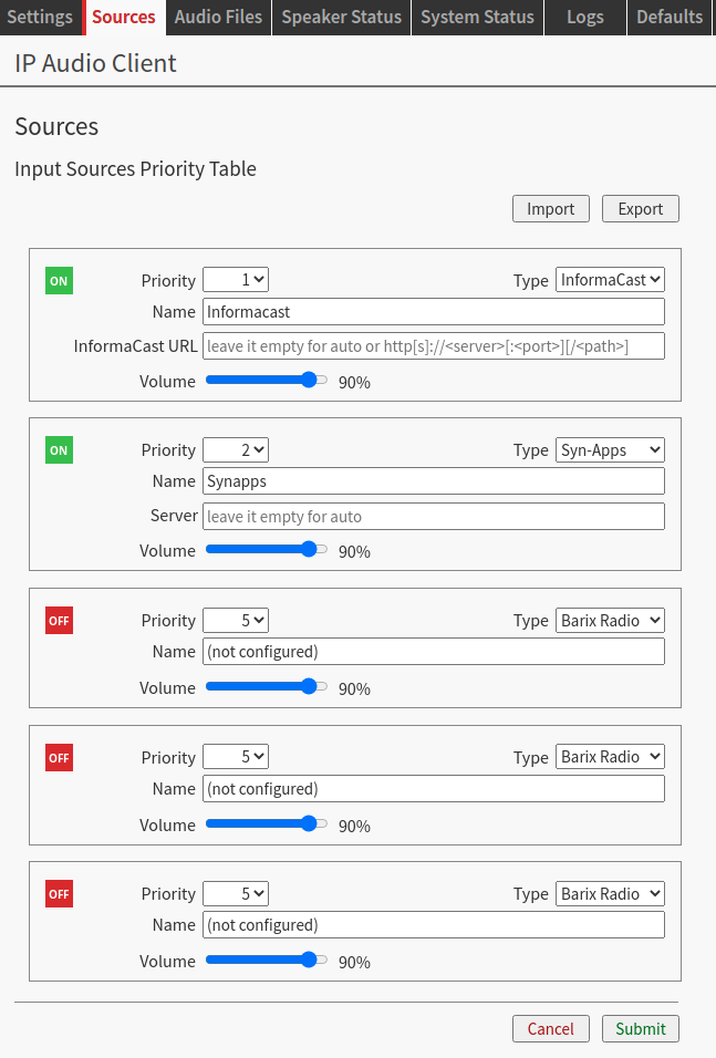 | 3 | Navigate to the Source page - by default the application runs InformaCast (if licensed) and SynApps. To play Barix Radio it is need to activate it on any one of the source ![]() |