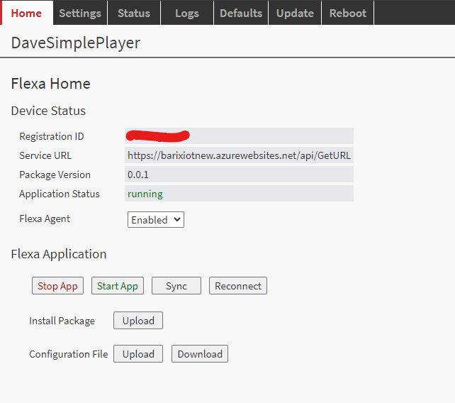 This page allows the stop and start of the Flexa application. It has button called “Sync” to run Flexa Agent and sync the application with the version selected on the service portal. As this application only runs on boot or periodically to contact remote Flexa services, it may be necessary to use this button to speed up the development when the application is served by service portal.