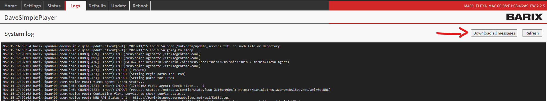 On the web UI of every Flexa device is possible to download log files from the LOG tab clicking on ‘Download all Logs’.