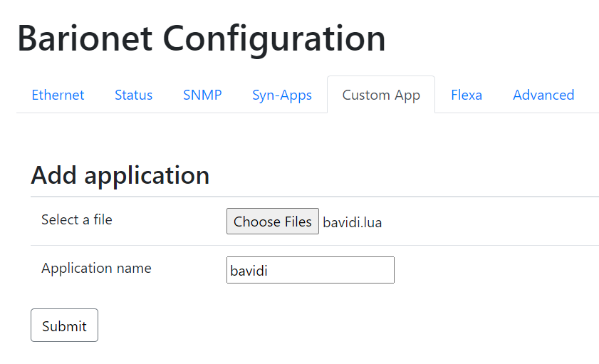 Open the Barionet web configuration interface and locate the "Custom App" tab