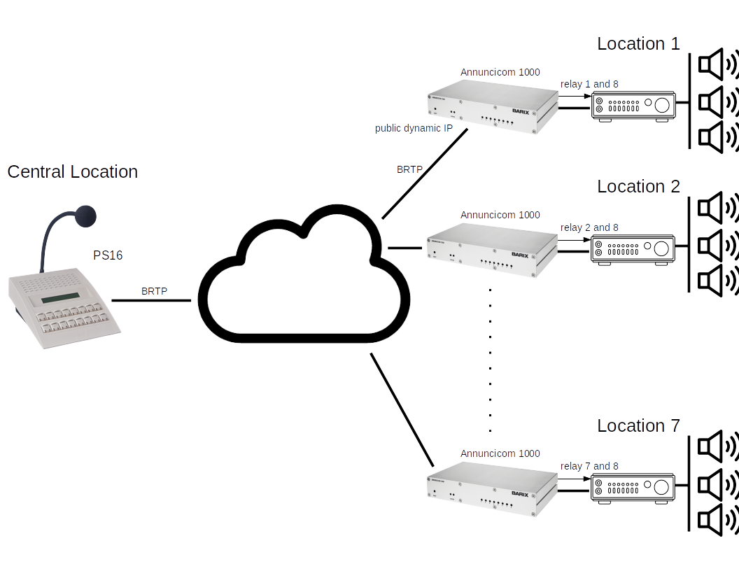 We will describe here how to set a Paging System with one Central Location and 7 Remote Locations spread over Internet, with public fix IP at Central Location only (e.g. the Remote Locations have 4G connections; devices are under NAT).