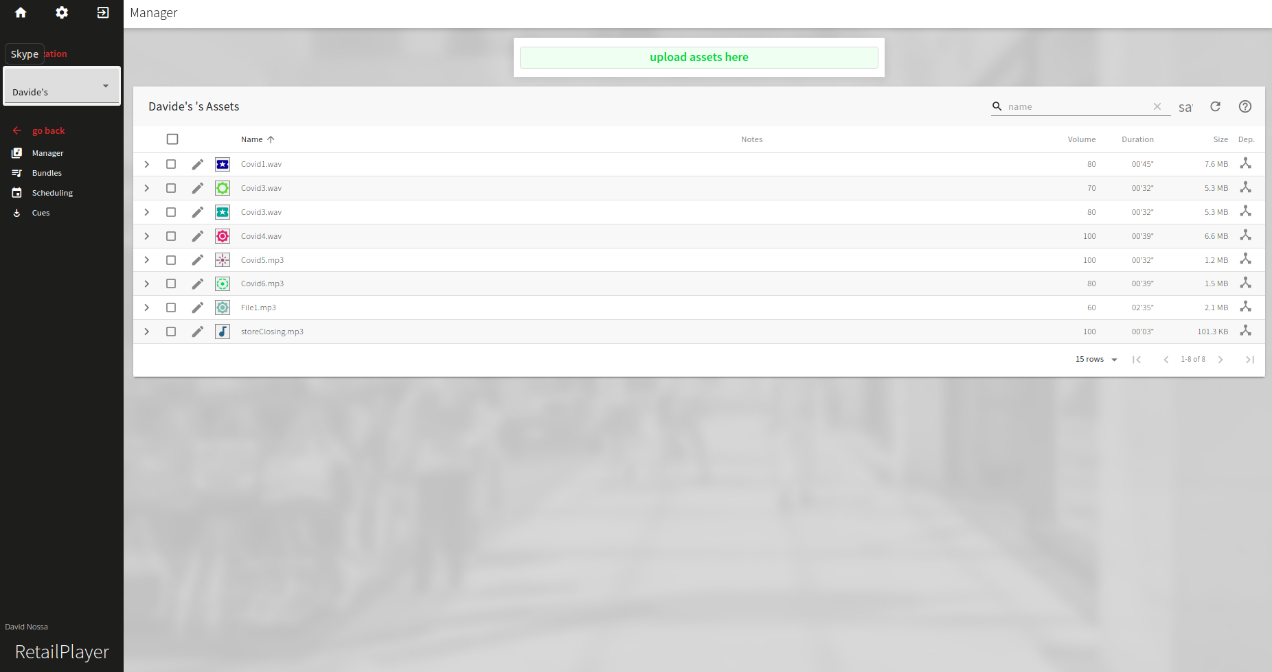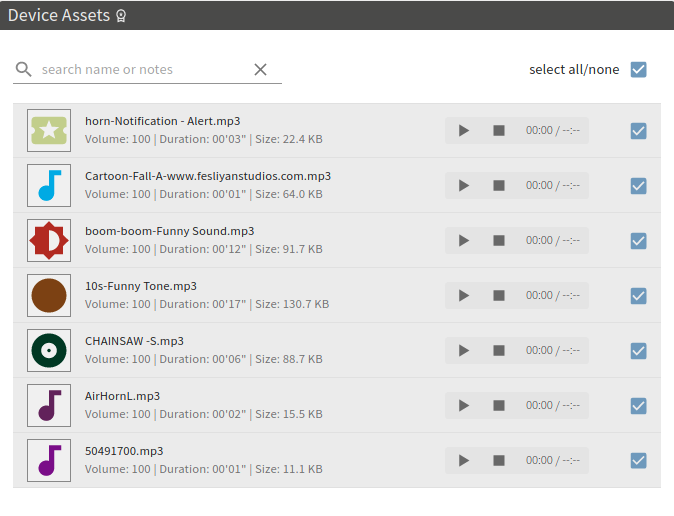 Always in the device context under the page Assets it is possible to check the audio files downloaded and ready to be used on the device. At the same time it is possible to anable / disable a specific file. This function comes handy for example if you are having a special deal ad playing in your shop, but for the offered product you already finished the stock. You can temporarily disable the corresponding ad and re-enable it when the material arrives.