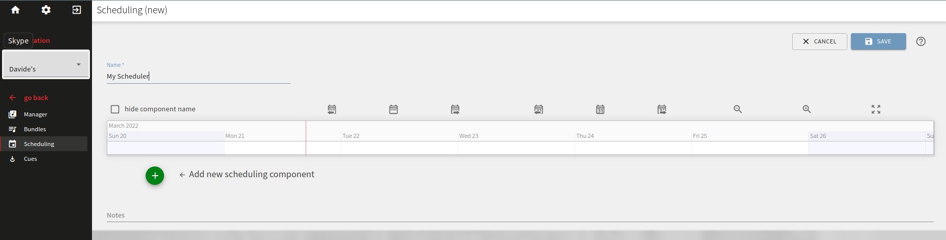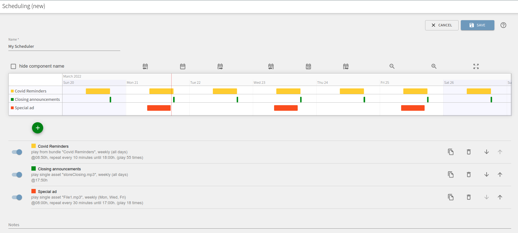 - An empty scheduler is created. Now it's time to create your first component. A scheduler is made up of "components". You can see each component as a dedicated scheduler for an individual asset or for a specific bundle. This is what allows the scheduler to contain multiple types of components, each with different needs e.g. closing announcements, that requires a one playback on each day from Monday to Friday or advertisements, that are more suited to play in a bundle over a defined time window on specific days of the week or month. In a scheduler it is allowed the creation of max. 20 components.