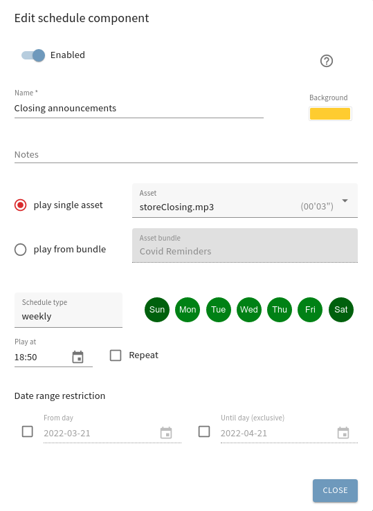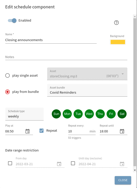- Configure the Date Restrictions if it's needed to play this component only within a certain period