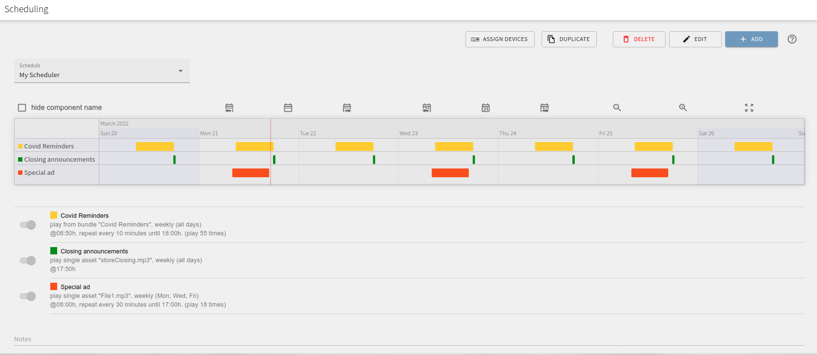 How to schedule messages, announcements, bells, ads and other assets on RetailPlayer