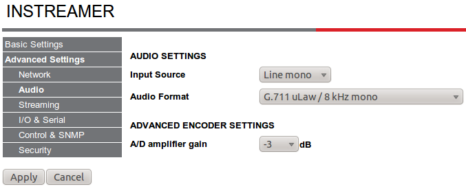 After configuring the network, the audio settings are modified to identify the appropriate input source, the encoding mechanism, and gain.