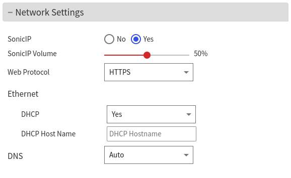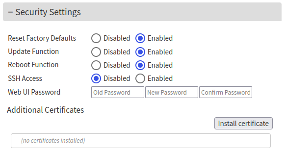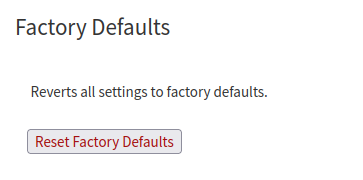 The Defaults page allows performing a soft-reset. Such operation reverts all settings except the network settings back to factory defaults (it doesn't perform a firmware downgrade, just a reset of the settings for the running application). The reset to factory defaults can be enabled or disabled from the settings page, under "Security Settings".