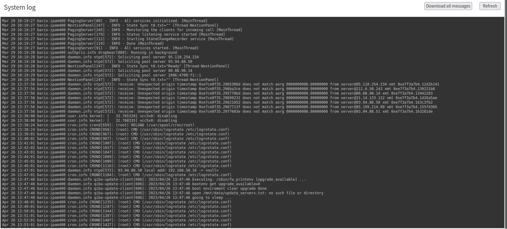 The Logs page displays the events occurring operation of the Paging Gateway device. Logs are useful for debugging issues, they give a detailed insight into every process within the OS. On the top-right corner it's possible to click the button “Download all messages” to download all log files.