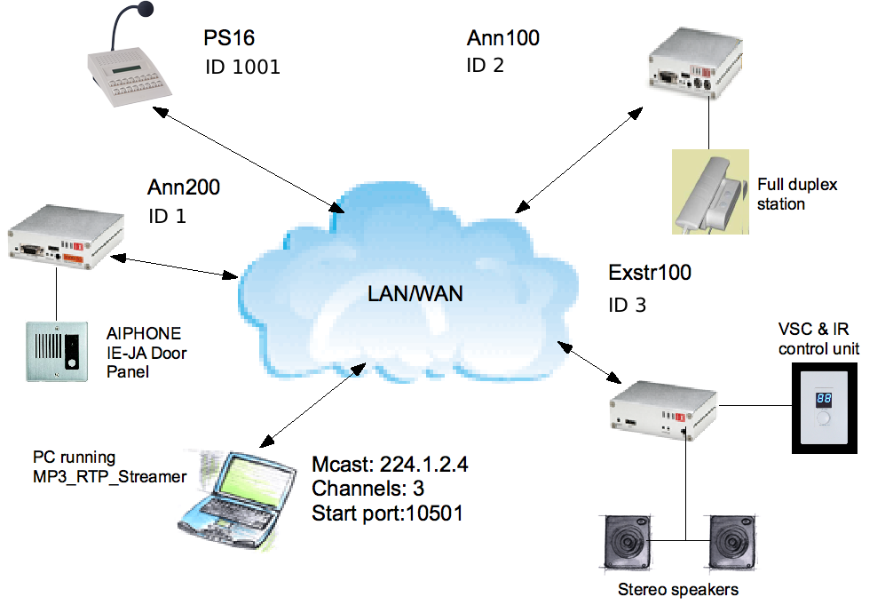 Annuncicom 200 – can be used as a master or as a client. Provides mono BGM, intercom, door relay control and paging endpoint functionality. When used as a client, the available two wire interface allows the device to use the AIPHONE door stations in half-duplex mode.
