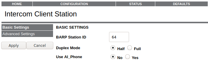 In half duplex mode press and hold to answer incoming call and start talking, release to listen. If the handsfree mode is activated, then the talk mode can be voice controlled. In this case the voice activation level, and the time-out are configured via the web UI.