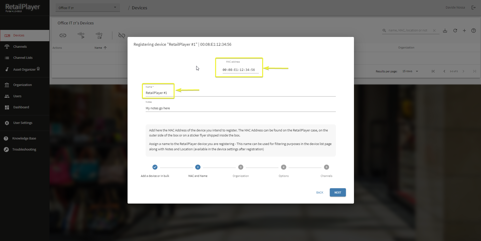 The device registration wizard opens: Fill in the MAC Address and assign the new device a name, then follow the rest of the wizard items according to your needs.
