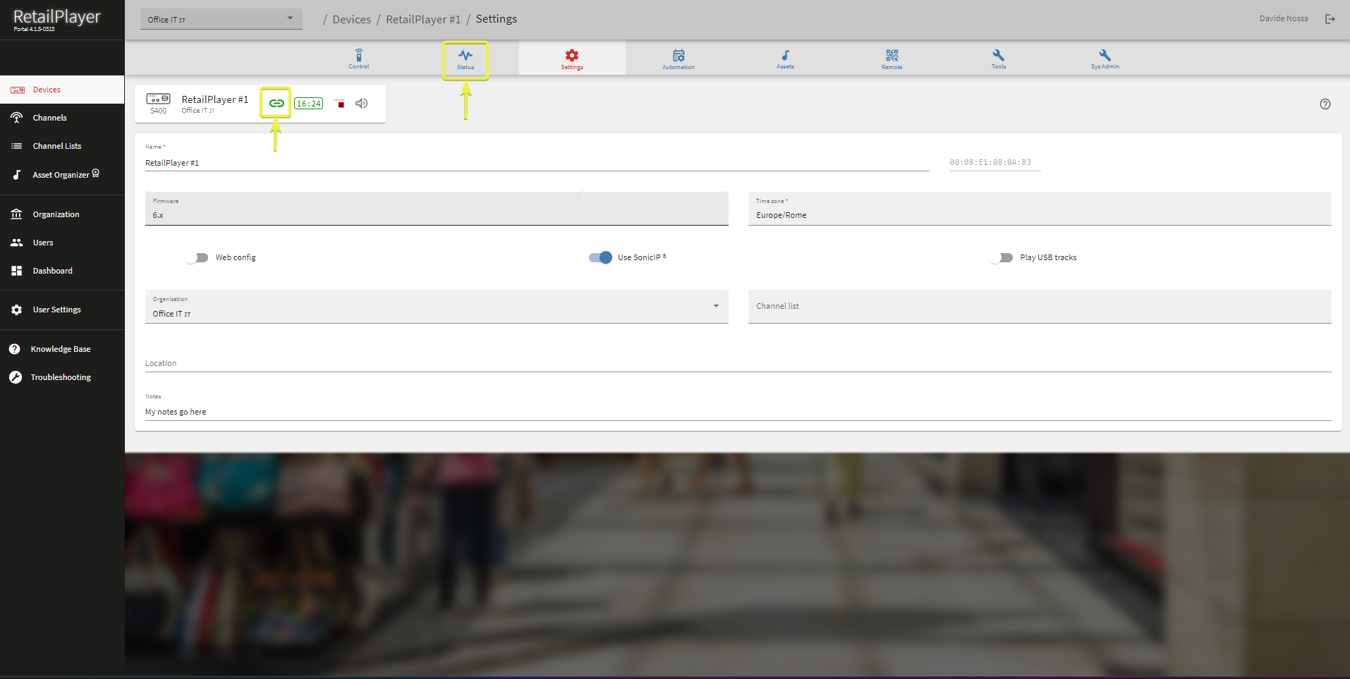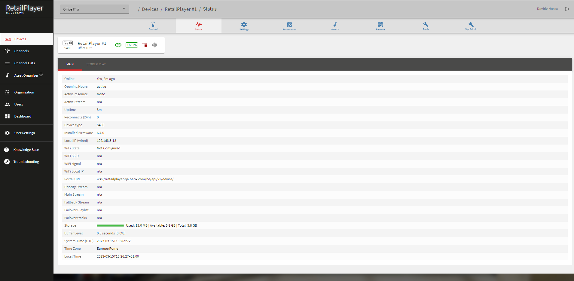 When the registration is complete, the device settings page is shown. If the RetailPlayer device is connected to the network in a few minutes it will be shown as ONLINE and the STATUS will present relevant information. The device now can be controlled and configured by the Portal.