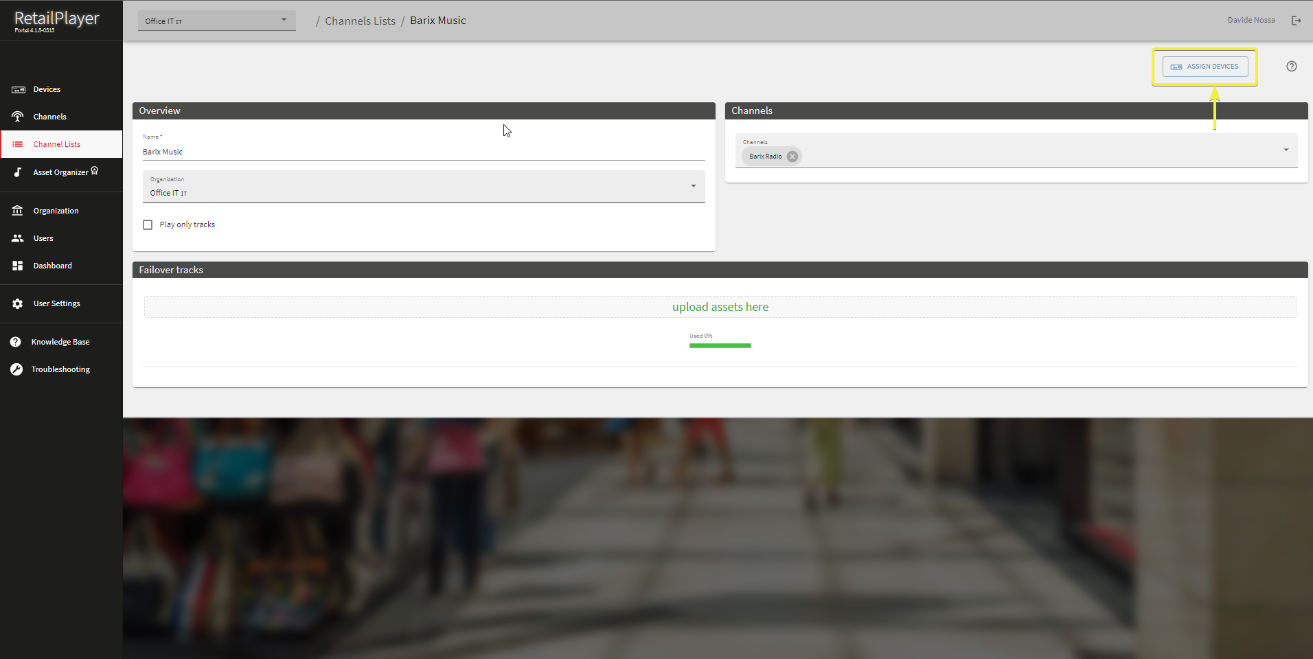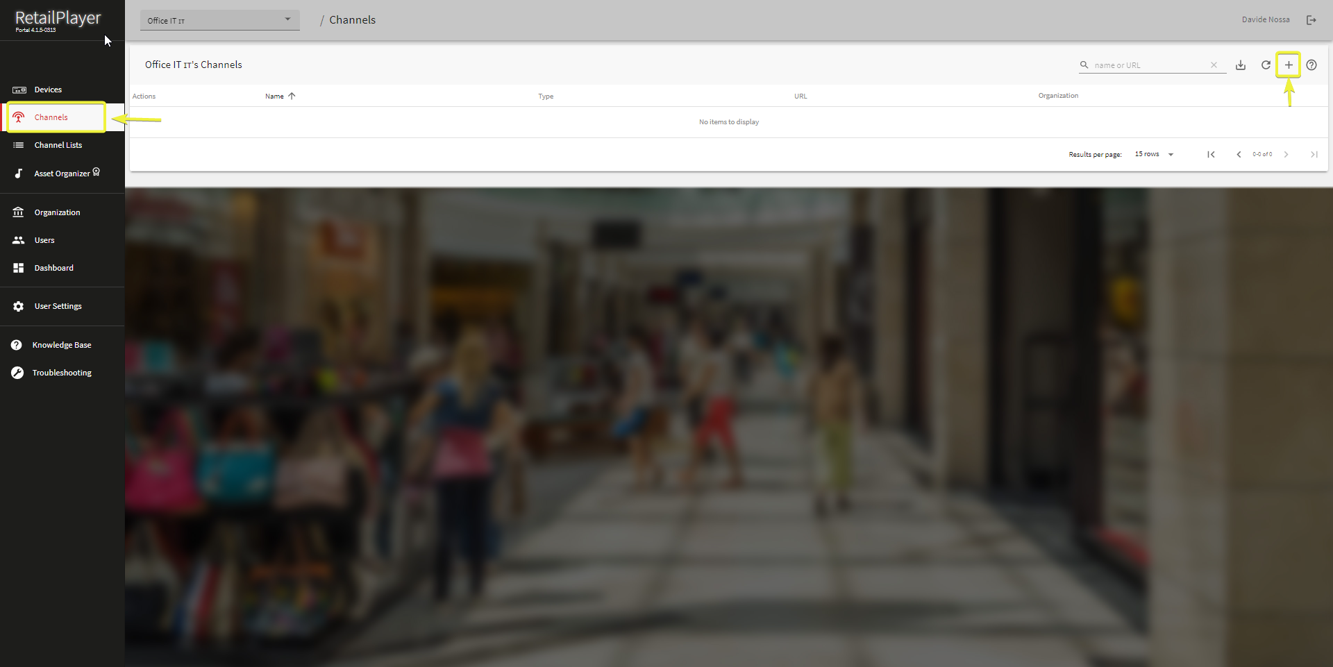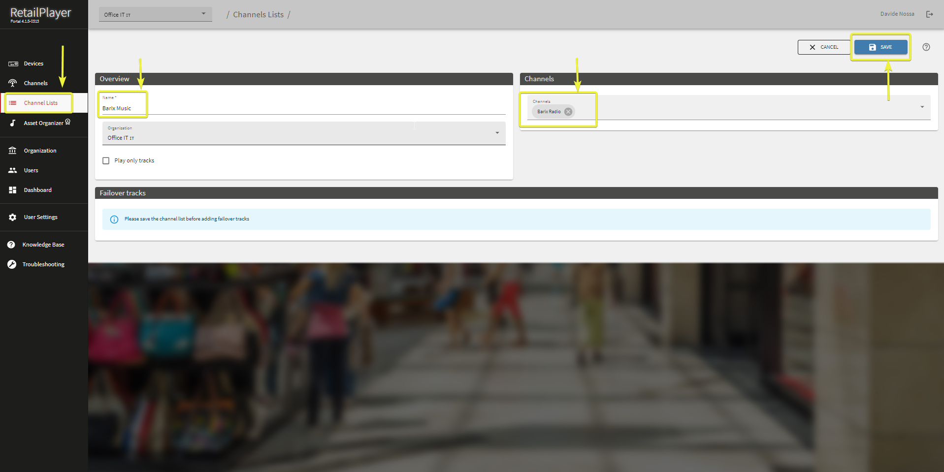 Now it’s time to add our channel(s) into a channel list that can be later be assigned to our RetailPlayer device. Locate the CHANNEL LISTS section and, like we’ve done for devices and channels, click on the '+' to open the Channel List creation page. In this page: