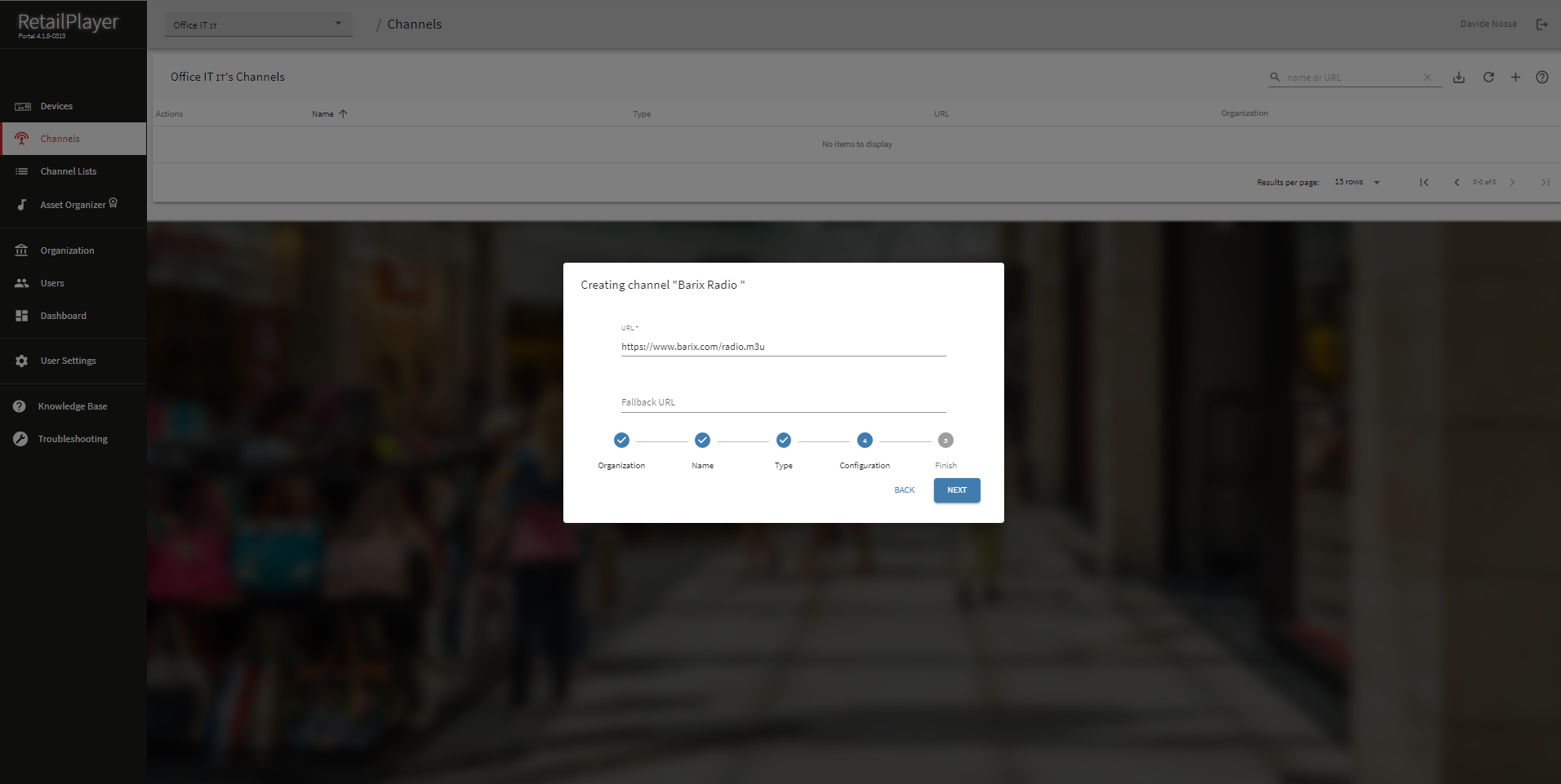 The channel creation wizard opens: select the organization the channel belongs to, assign a name to the channel (i.e. 'Barix Radio), Select the type of channel you intend to create between store and play (play files downloaded from a fileserver) or a stream (connect to a streaming server). In our example here, Barix Radio is a stream. Select stream and continue filling in Barix Radio URL in the MAIN STREAM parameter (https://www.barix.com/radio.m3u) - Confirm the channel creation.