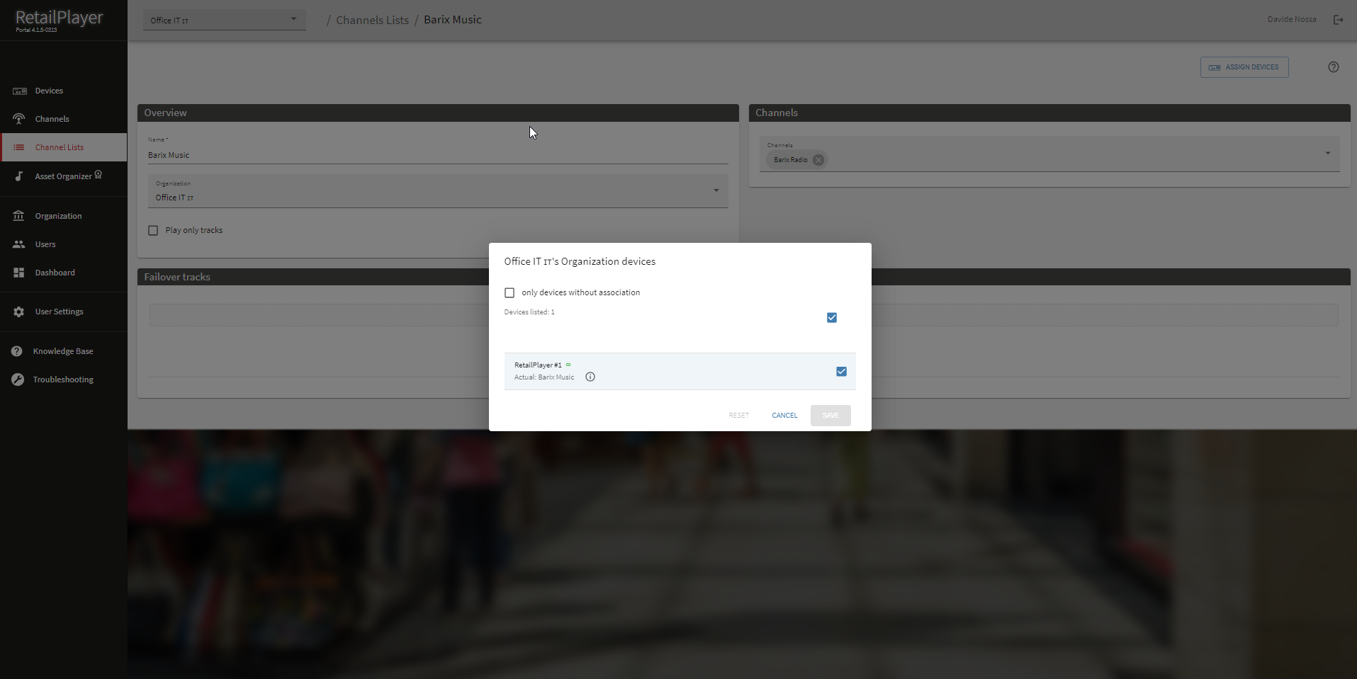 Now that we have the channel list created, without leaving this page, click on the ASSIGN DEVICES - This opens up a dialogue that allows the selection of devices registered in the same ORG the user is operating into. Select the device we just registered and click on Save.
