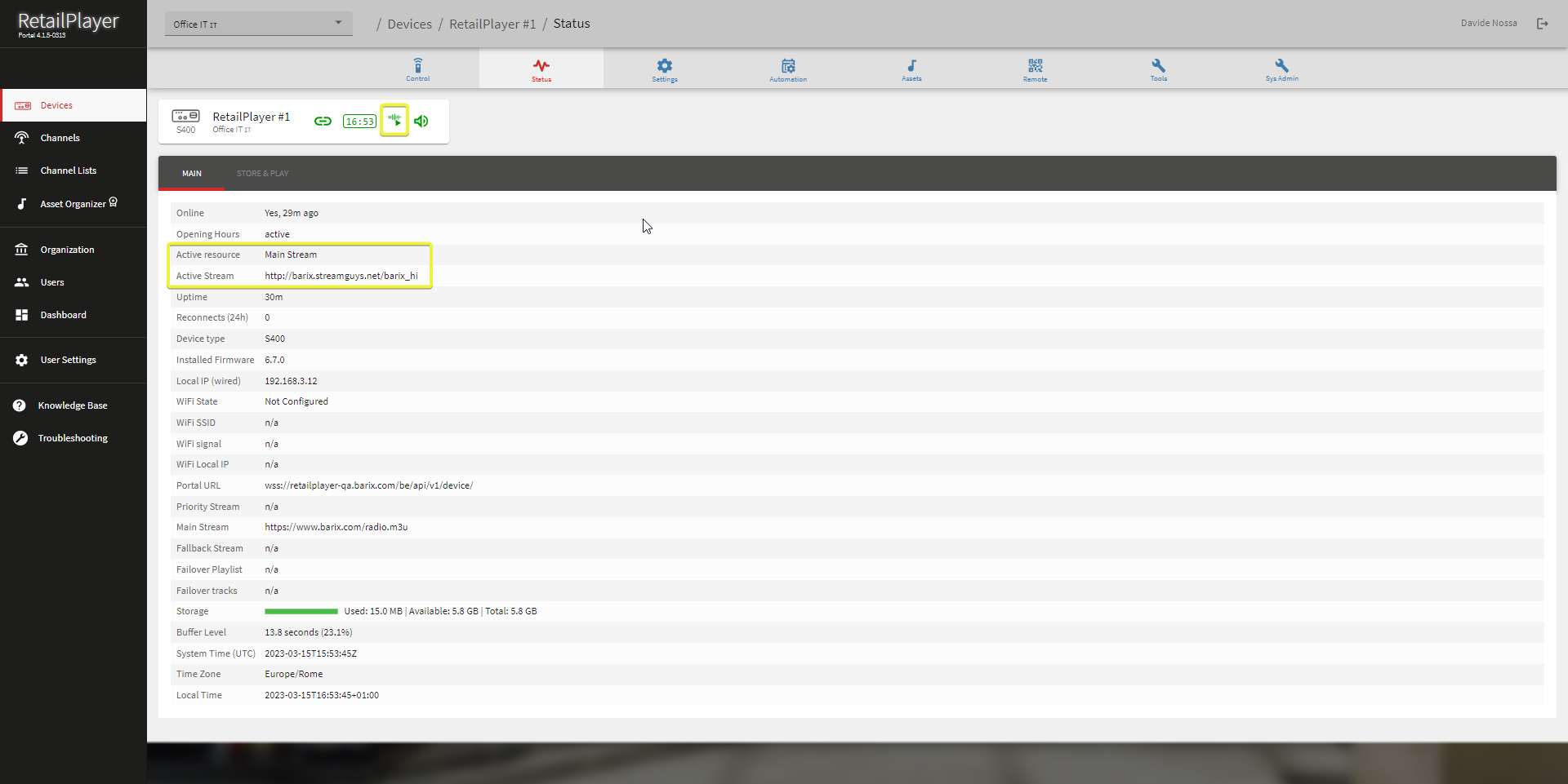 At this point the channel present in the channel list assigned to the device will start to play after a few seconds. You can monitor the new status in the device status page or by looking at the useful widgets on the device list