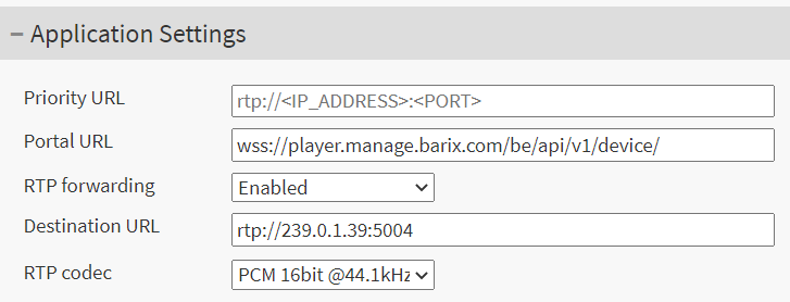 Priority URL | The Priority URL will interrupt any audio currently being played. By default, this field is empty. It is particularly useful for interfacing the RetailPlayer with any paging device capable of sending audio over RTP, thereby overriding the background music. The device supports RTP in multicast, unicast, or broadcast formats. When using any RTP static payloads the URL schema is as follow: For non-standard payloads, use the following URL schema: