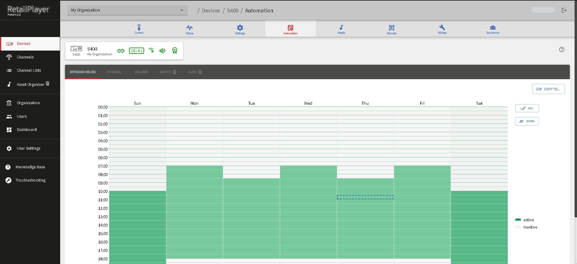 Device automation - Channel scheduler | This privilege grants the user can specify which channels from a set channel list the device should play, based on the Opening Hours schedule. |
