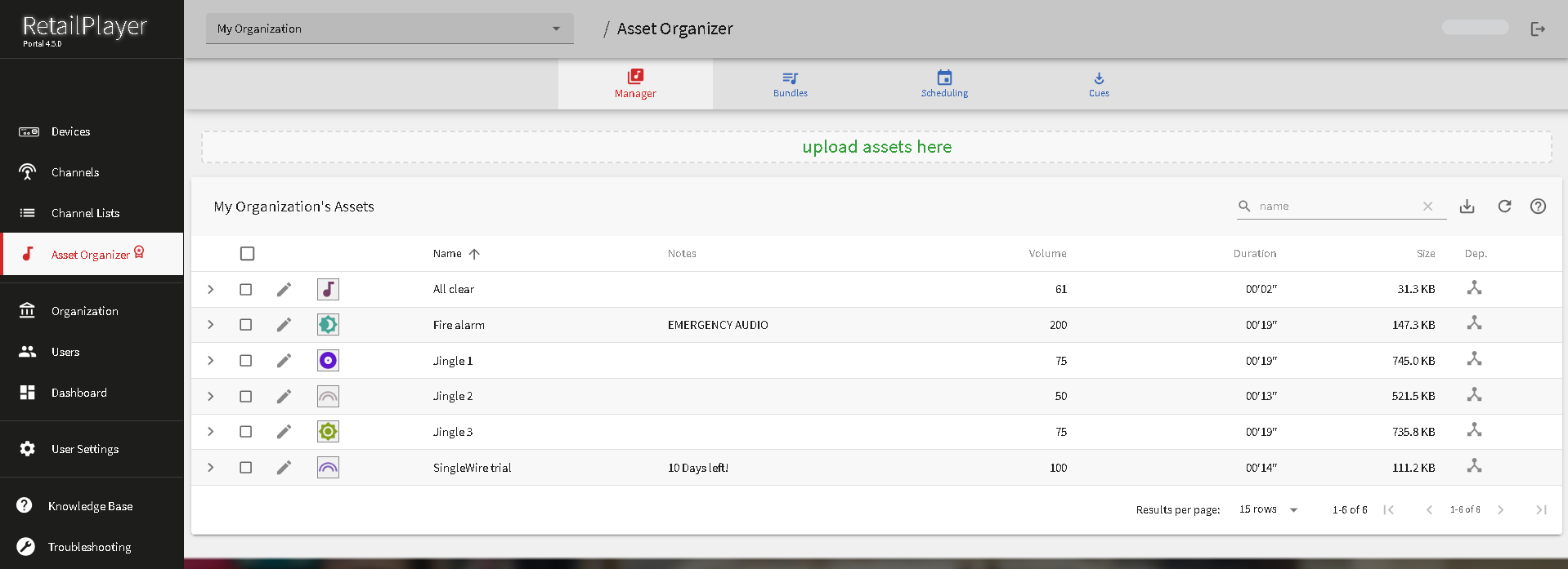 Asset organizer - Scheduling | With this privilege, the user can access the Scheduler that enables the programming of "components," which can contain either single audio assets or entire audio bundles. |