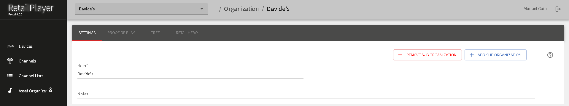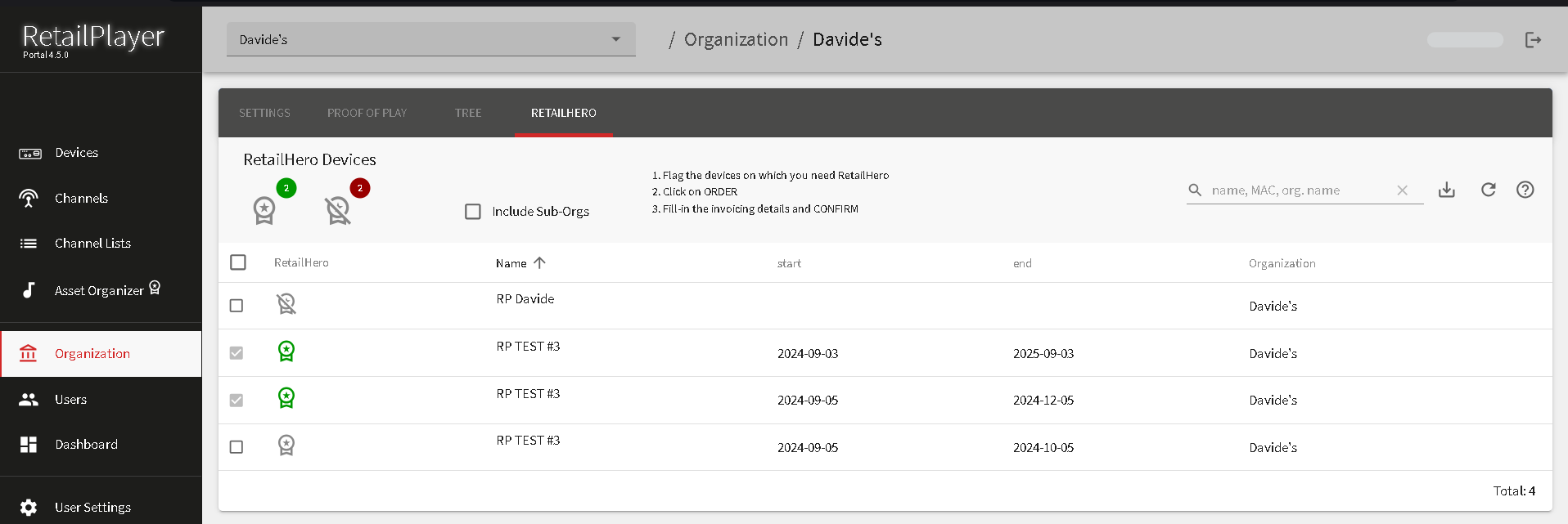 Organization settings - RetailHero | With this privilege, the user can access the RetailHero section on the organization page, which displays a comprehensive list of all registered devices. |