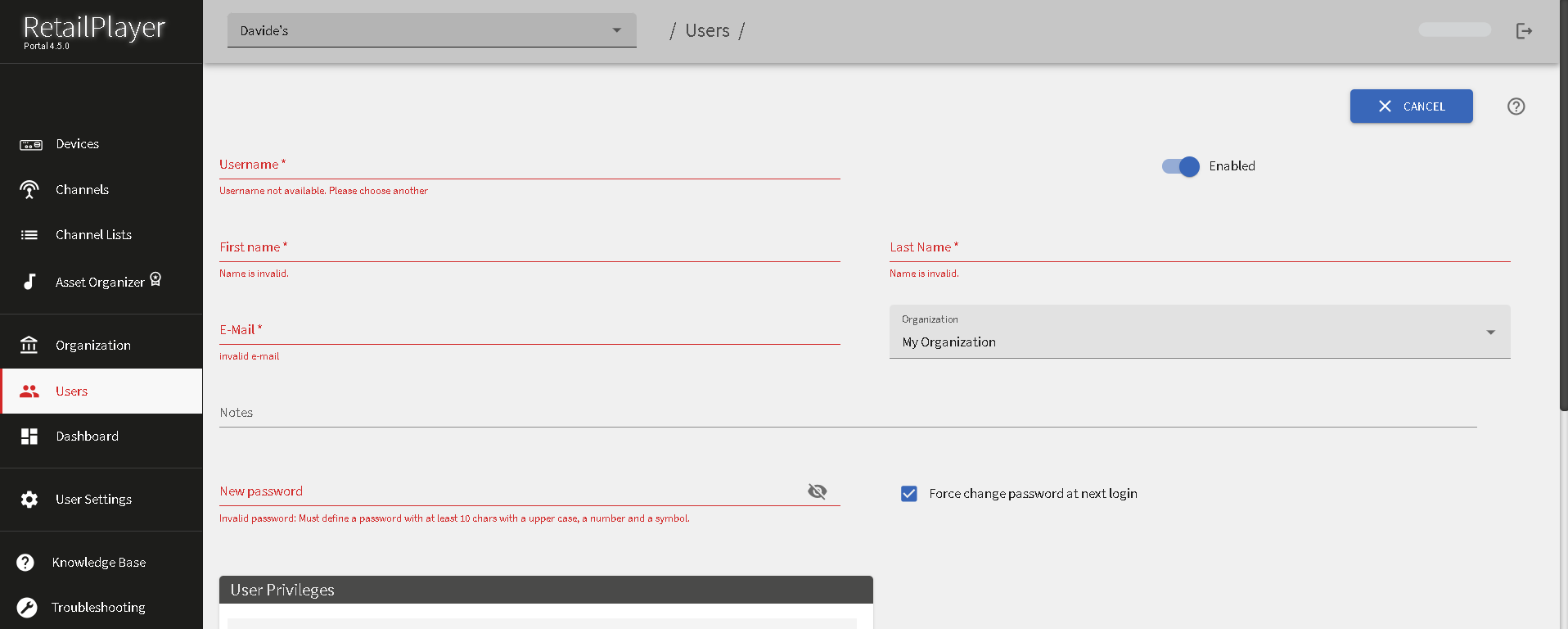 ORG UNITS: A newly added user is always assigned to the organization unit of the administrator creating the user. One user can be part of multiple organizations, thus controlling devices, users, channel lists if allowed to do so from the roles panel.
