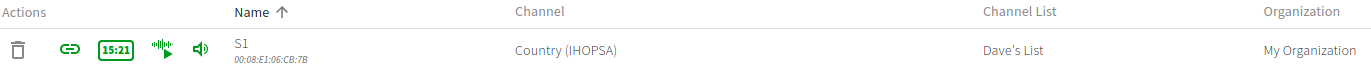 Within the tree view, you will see a list of sub-organizations and associated resources, such as Channel Lists and Devices. Each entry has icons that indicate the type of resource it represents. For instance: