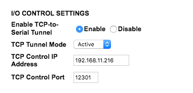 Next, set the sending device in “Active TCP Mode”, and set the receiving device IP as “TCP Control IP Address”
