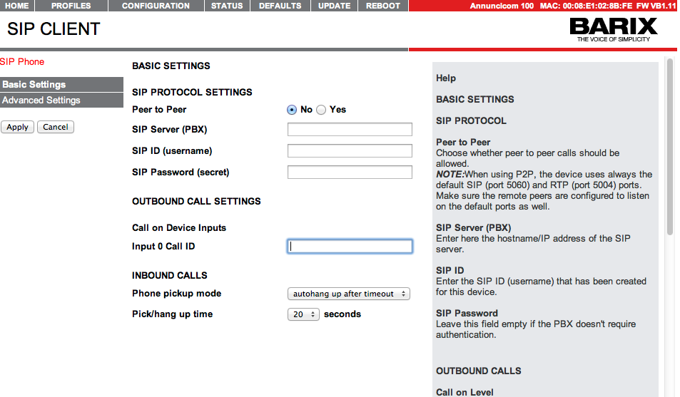 If you do not have a SIP account, you can still use the SIP client Peer-to-Peer mode. In this mode the device needs to “register” to itself. For this purpose configure its own IP address as SIP Server/PBX, and leave the password field empty.
