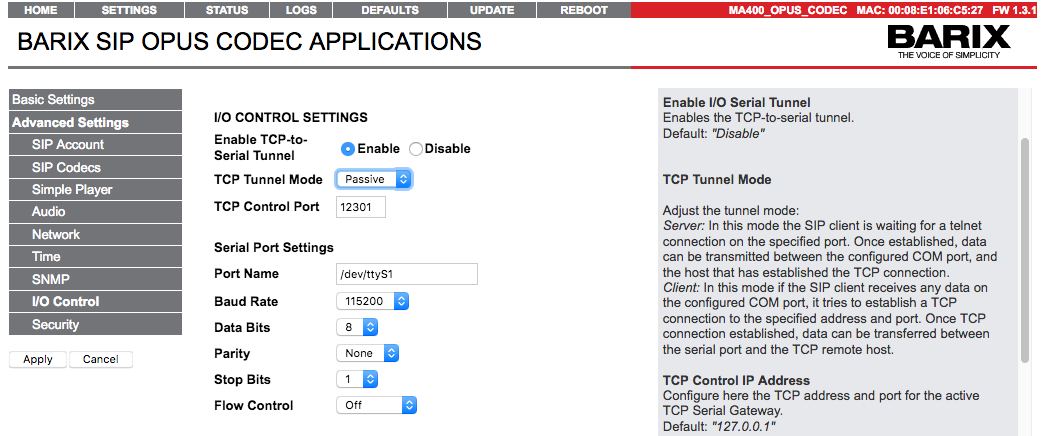To enable it, set the “TCP Tunnel Mode” from the “Passive”, and “Enable TCP-to-Serial Tunnel” option to “Enable”. The remote host must open a TCP connection to the SIP client in order the gateway to be functional. The TCP port to which the SIP client will listen for incoming TCP connections is configured via the TCP Control Port option.