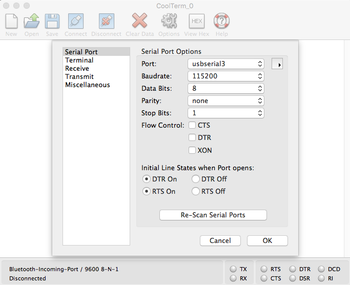 Set the Baudrate, Start/Stop and Flow control bits as configured on the SIP OPUS Codec device. Your serial port name may vary, in this case we are using USB-to-RS232 adapter, that appears as usbserial3 device on the Mac. After configuring all options, click “OK”, then click the “Connect” button to open the COM port device.